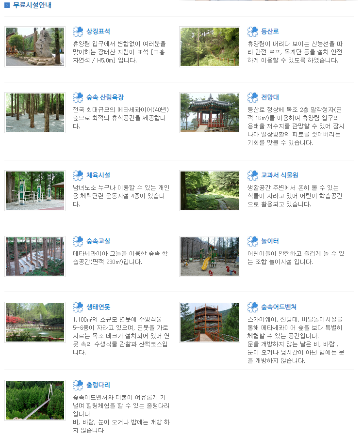 이곳은 연중무휴로 운영되어 언제든지 방문이 가능하며, 입장료도 무료입니다. 다만, 숙박시설이나 특정 유료 체험 시설은 별도의 비용이 발생할 수 있으므로, 장태산 공식 홈페이지를 통해 자세한 요금을 확인하는 것이 좋습니다.