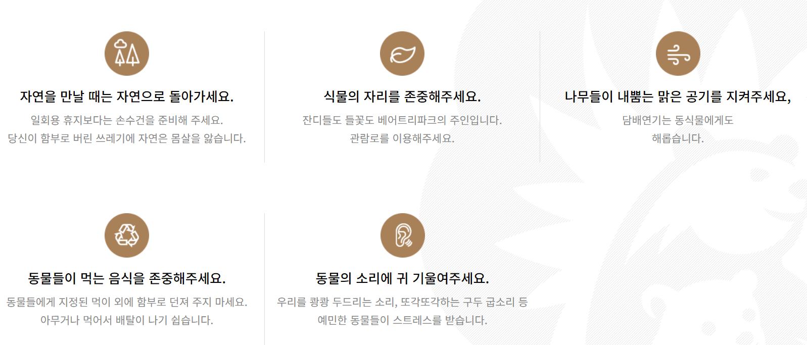 방문객의 안전과 환경 보전을 위해 베어트리파크는 다음과 같은 규칙을 유지하고 있습니다:
