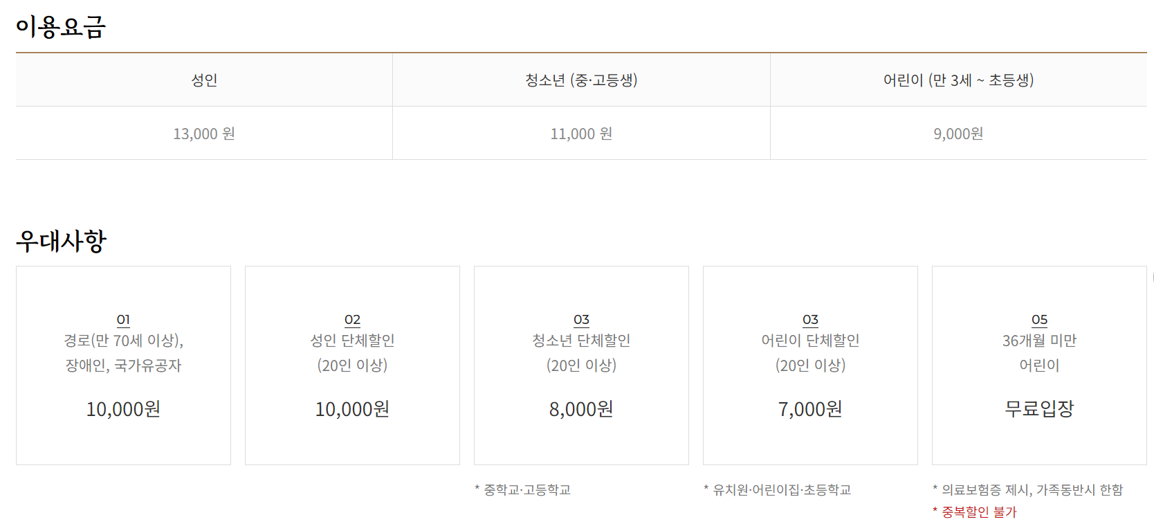 - 입장료: 성인 13,000원, 청소년 11,000원, 소인 9,000원 / 성인단체(20명 이상) 10,000원