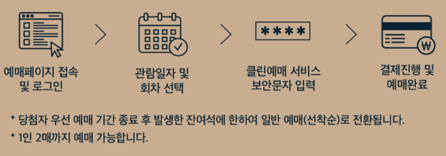 (3) 8/29 (오후 5시부터) ~ 9/5 (23:59시 마감) 당첨자는 예매 페이지에서 당첨자 인증 및 관람일자, 회차를 선택하고 결제 진행하면 예매가 완료됩니다.