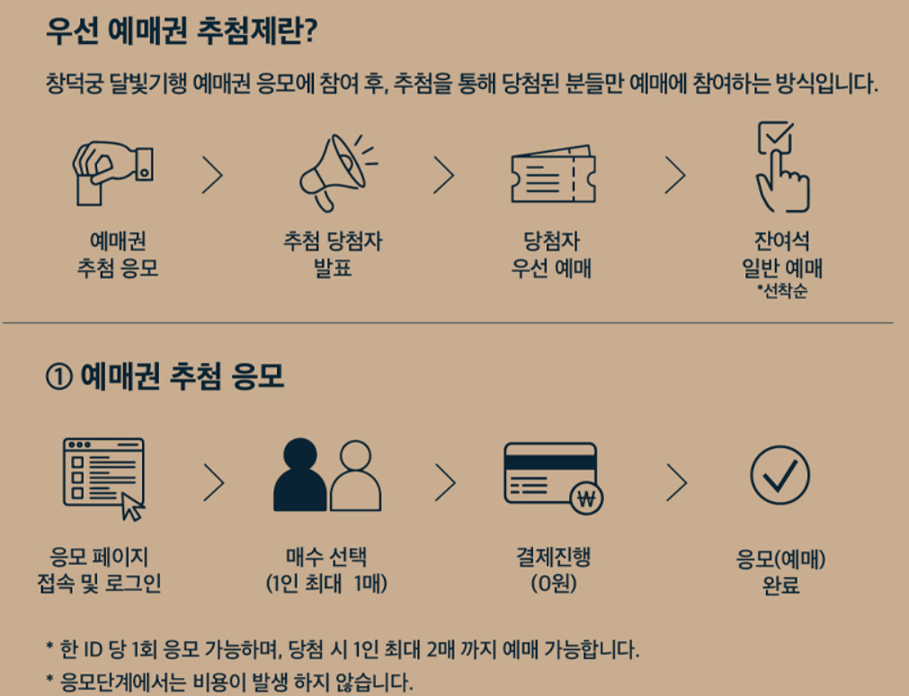 아름다운 창덕궁을 저녁에 감상할 수 있는 창덕궁 달빛기행은 한정 인원으로 한정 기간 동안 예매 추첨을 통해서 이뤄지기 때문에 운 좋은 사람들만 관람이 가능합니다. 봄과 가을 일 년에 두 차례 있는 이 행사의 예매기간을 놓치면 잔여석을 예매할 수 있는 기회가 있습니다. 그럼 창덕궁 달빛기행 예매 방법과 어떤 행사인지 알려드리겠습니다.