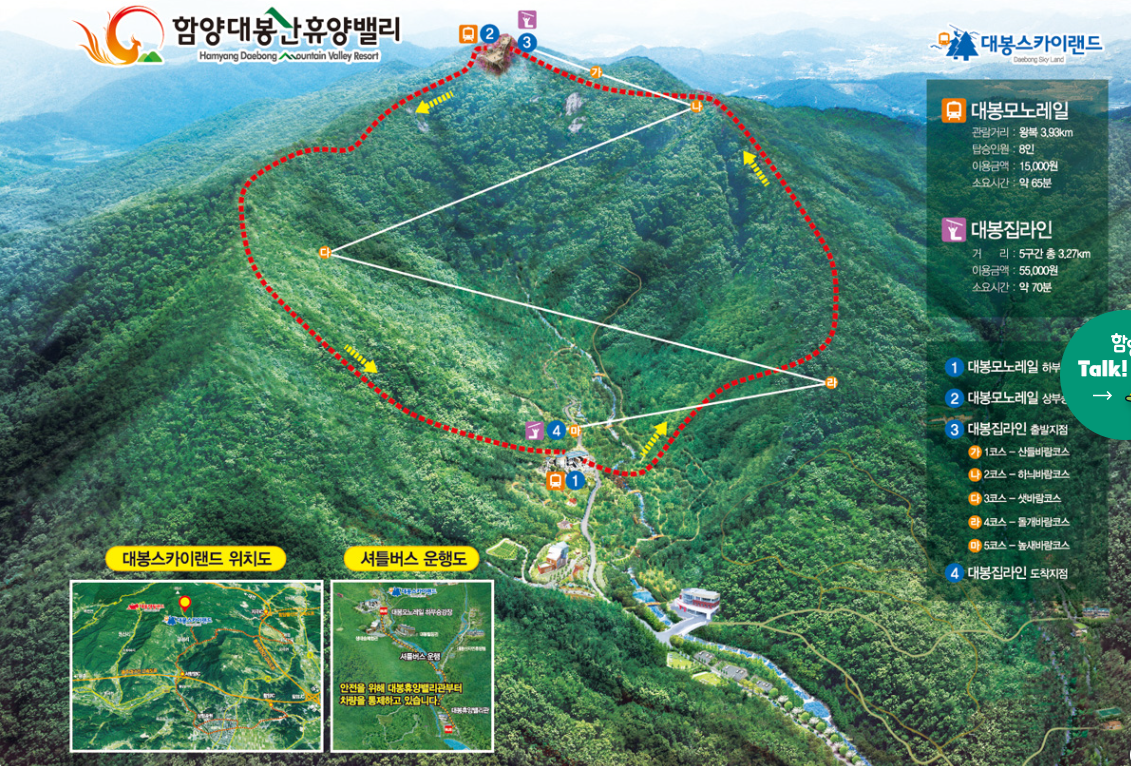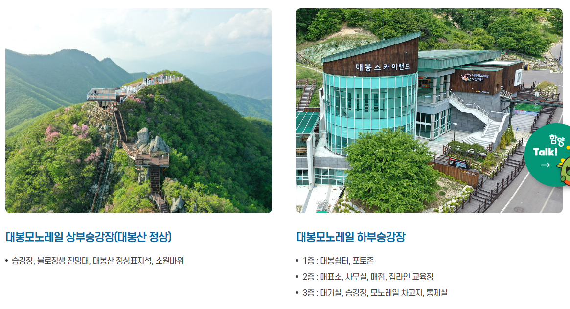 - 모노레일: 대봉산의 정상까지 이어지는 3.93km의 모노레일은 편안한 여행을 제공합니다. 사계절의 아름다움을 감상하며 대봉산 정상에 올라보세요.