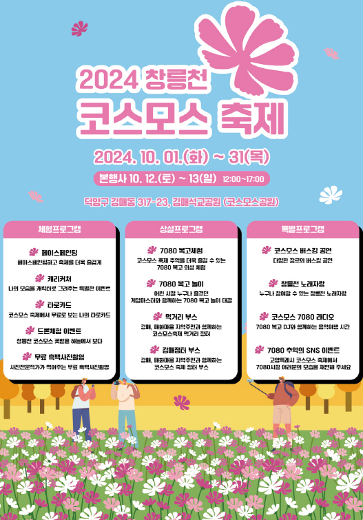 이번 코스모스 축제는 경제적인 한편 자연과 문화를 동시에 느낄 수 있는 좋은 기회입니다. 가족, 친구들과 함께 아름다운 추억을 가득 담아가시길 바랍니다.