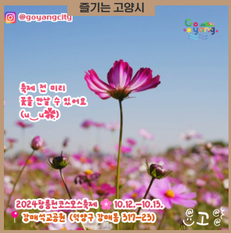 고양특례시 창릉천 강매석교공원에서 자연이 선사하는 가을의 아름다움을 느낄 수 있는 '창릉천 코스모스 축제'가 10월 12일부터 13일까지 이틀간 열립니다. 화려하게 만개한 코스모스 꽃밭이 여러분을 기다리고 있으며, 이곳에서 특별한 가을의 추억을 남기실 수 있습니다.