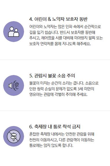 불꽃축제를 보다 안전하고 즐겁게 경험하기 위해, 불꽃쇼 관람 위치와 시간을 사전에 확인하고 미리 자리 잡는 것이 좋습니다. 공원 내 카메라용 삼각대, 간단한 의자와 같은 필수 아이템을 챙기면 편리함이 배가됩니다.